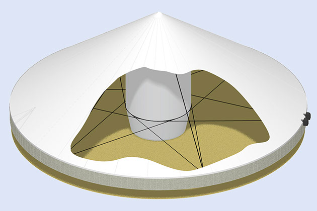 Afin de contrer tous ces problèmes, j’ai développé un nouveau concept de toiture. Également de forme conique mais dont l'originalité tient à son pilier central gonflable et flottant. Gonflé à une pression 4 à 6 fois plus grande que la voilure, il permet de supporter des charges de neige impressionnantes et de résister aux plus grands vents. Son effet piston maintient si bien la voilure en tension, que celle-ci soit gonflée ou non, la différence est à peine perceptible. Ainsi, on peut se permettre d’avoir une ouverture aussi grande que nécessaire pour l’opération de reprise du lisier sans aucun risque, peu importe les conditions de la météo. En fait, le gonflement de la voilure est surtout utile en cas de tempête de neige exceptionnelle.