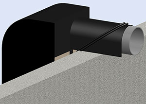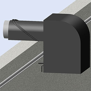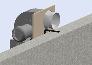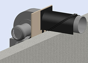 Le concept développé comprend d’abord le souffleur monté sur une construction de tubulure d’acier et contreplaqué. Le tout est fixé solidement au mur, mais à une distance d’environ 10 cm pour permettre l’écoulement de la neige. Par la suite, viennent se greffer clapet anti-retour, adaptateur et tuyau de conduit. Dans le cas du ballon interne, il y a un long tube annelé qui traverse le tuyau de conduit. Pour servir de réceptacle à la voilure, il y a une capote de polyéthylène rigide. Elle comporte deux protubérances dans l’axe de la voilure pour l’étanchéité.