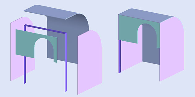 Le système de soufflerie est à la base de la performance d’une structure gonflable. Dans le cas présent, il y a deux systèmes indépendants et différents par leur puissance respective. Ce qui les distingue, c’est essentiellement le modèle de souffleur et le moteur pour l’activer. Pour le reste, il n’y a pas de différence notable et les deux boîtiers sont semblables et prévus pour convenir aux deux systèmes. Cependant, les deux systèmes doivent alimenter leur "ballon" respectif en traversant la membrane. Chaque système de soufflerie est alors fixé à la base de la voilure, en bordure du mur. La bordure de la voilure est configurée pour épouser la conduite qui chevauche le mur. C’est justement l’endroit où la membrane a la liberté de mouvement minimum rendant sa position dans l’espace prévisible. Comme il n’y a plus de pièce mobile fixée à la membrane, on prévient le risque de fatigue du matériau et de bris des joints.