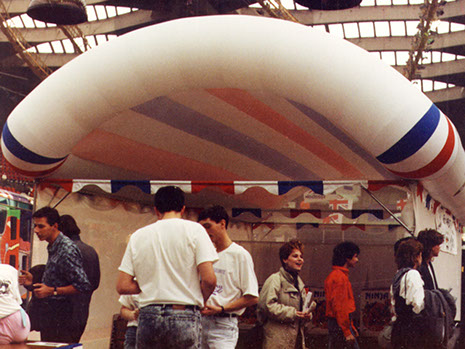 Très élémentaire comme toiture à double membrane et d'une certaine façon, c'est sa simplicité qui fait son charme. C'était au Salon de la Jeunesse à Montréal, au début des années'80. Le client était un organisme qui faisait la promotion du tir à l'arc avec démonstrations sur place. Le mandat était de couvrir un espace de 5 mètres (16') par 10 m pour empêcher des flèches de s'échapper hors de l'enclos. Sur trois côtés, c'était uniquement des filets. Étonnamment, ceux-ci suffisent pour arrêter une flèche. Mon collègue et moi avions dix jours pour trouver une solution et livrer le produit.