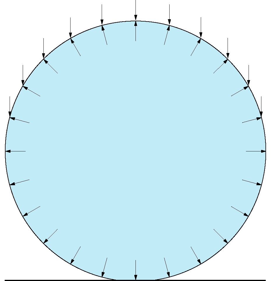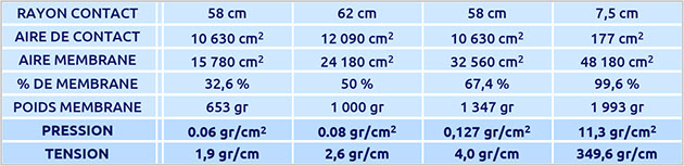 Comme la surface de contact est aussi la surface d'appui pour que la pression puisse supporter le poids de la membrane, on peut connaître la pression nécessaire pour garder émergés 250 litres avec la formule suivante: