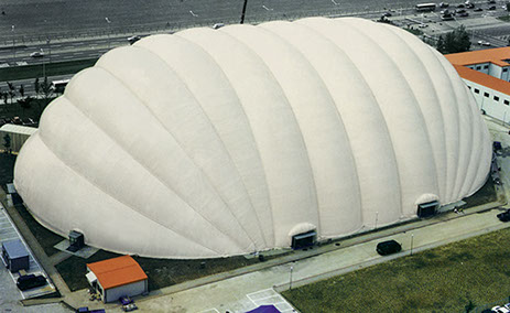 Dans la photo, on voit une structure gonflable de 70 m (230') de largeur. Dans les vallées entre les anneaux, il y a un câble d'environ 4 cm de diamètre. Il sert à prendre de la tension de manière à soulager la membrane qui autrement ne résisterait pas.