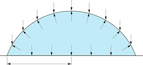 Dans tous les cas, la démonstration a porté sur une sphère de 1 m3 résultant d'un rayon de 62,035 cm. On pourrait refaire l'exercice en faisant varier ce rayon. On constaterait alors que la longueur du rayon a une incidence directe sur la tension. Ça explique pourquoi amorcer le gonflement d'un ballon de fête demande tant d'efforts, qu'on tiendra la pression d'un pneu de vélo à plus de 100 psi (lb/po2), d'une auto à ± 30 et pour une structure gonflable telle que dans la photo, la pression de service est autour du poids d'un pouce d'eau (2,5 cm), soit 0,03611 psi.