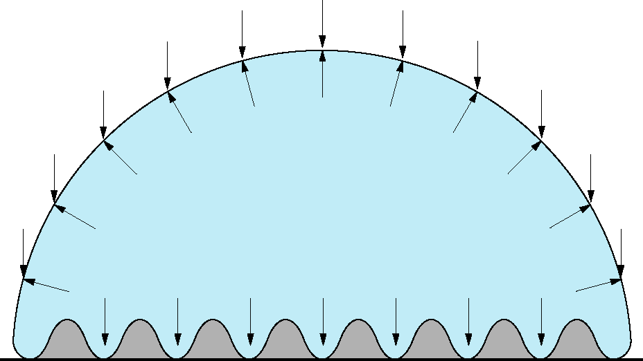 Dans les exemples précédents, on a considéré un emplissage exacte, c'est-à-dire juste suffisant pour atteindre le volume visé sans ajouter de pression autre que celle générée par le poids de la membrane. Bref, c'est la pression minimale possible. Malgré cela, on peut constater les grands écarts de tensions proportionnels à la pression. Si on l'augmentait, le rapport resterait le même.