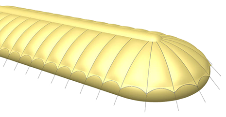 Ci-contre, allure que pourrait prendre une version allongée du concept. On peut remarquer que le mur n'est plus une section de cône mais plutôt des sections de cylindre et de tore, soit des formes gonflables.