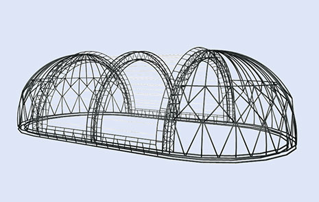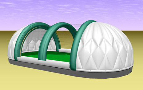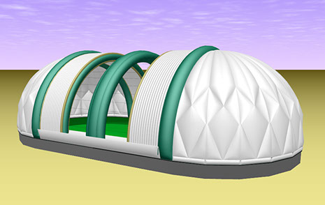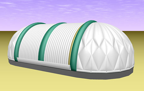L'illustration montre un bâtiment de 40 mètres x 76 m. (131' x 249'). Chacune des ouvertures du toit fait 16,65 mètres (55'). Entre les arches, on peut voir des câbles qui traversent. Ils servent de guides et de supports pour le déploiement des deux toitures. Pour ouvrir, des treuils compressent la voilure gonflable: pour fermer, on relâche graduellement la tension des treuils tout en regonflant la double voilure.